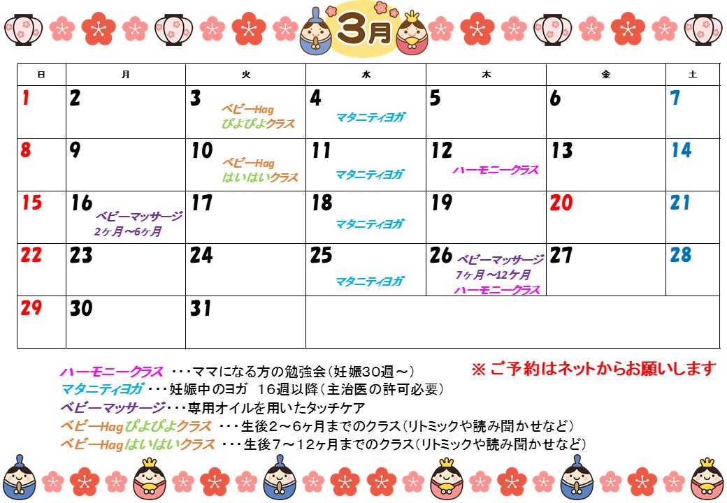 2月の教室案内 TOP 2月の教室案内 2月の教室スケジュールです ご予約は2月26日(月)14時より下記予約サイトにて開始致します(*^^*) 教室web予約サイト 2026年2月よりベビーHagの開始時間を10時30分から10時に変更いたします 1月の教室案内 TOP 1月の教室案内 ご予約は12月24日(水)14時より下記予約サイトにて開始致します(*^^*) 教室web予約サイト 皆さまのご予約お待ちしております 年末年始の診療について TOP 年末年始の診療について 12月の教室案内 TOP 12月の教室案内 ご予約は11月21日(金)14時より下記予約サイトにて開始致します(*^^*) 教室web予約サイト 皆さまのご予約お待ちしております